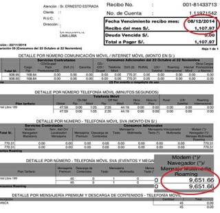 Gracias a esta promoción miles de usuarios portaron sus líneas post pago a la operadora, aunque al parecer habrían algunos pocos que estarían lamentando esta decisión. En las últimas horas hemos recibido al menos seis diferentes reportes de usuarios que habrían encontrado en sus recibos montos de hasta 1,107 nuevos soles, esto por concepto de uso de datos por encima del consignado en su plan.