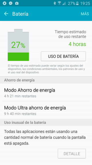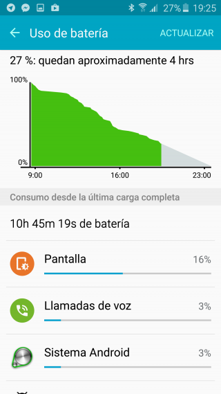 La batería se ha reducido, pero Samsung prometió que con un procesador de menor requerimiento energético (Exynos 7420) y memoria tipo DDR4 el consumo total del equipo sería menor. Lamentablemente no pus en la ecuación la pantalla QHD, por lo que la vida del teléfono es aproximadamente la misma del Galaxy S5.