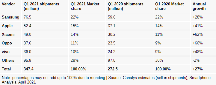 Por supuesto, Samsung y Apple también distribuyeron más teléfonos en este trimestre, pero digamos que era algo que ya se esperaba (especialmente con Apple y sus iPhone 12).