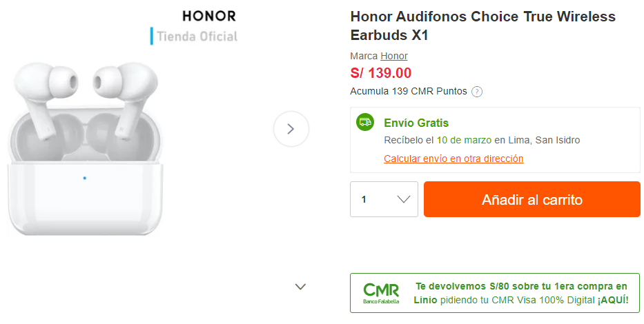 Y es que tal como podemos observar, los audífonos Honor Choice True Wireless Earbuds X1 se vienen vendiendo ya a través de Linio, con un precio de salida de 139 soles.