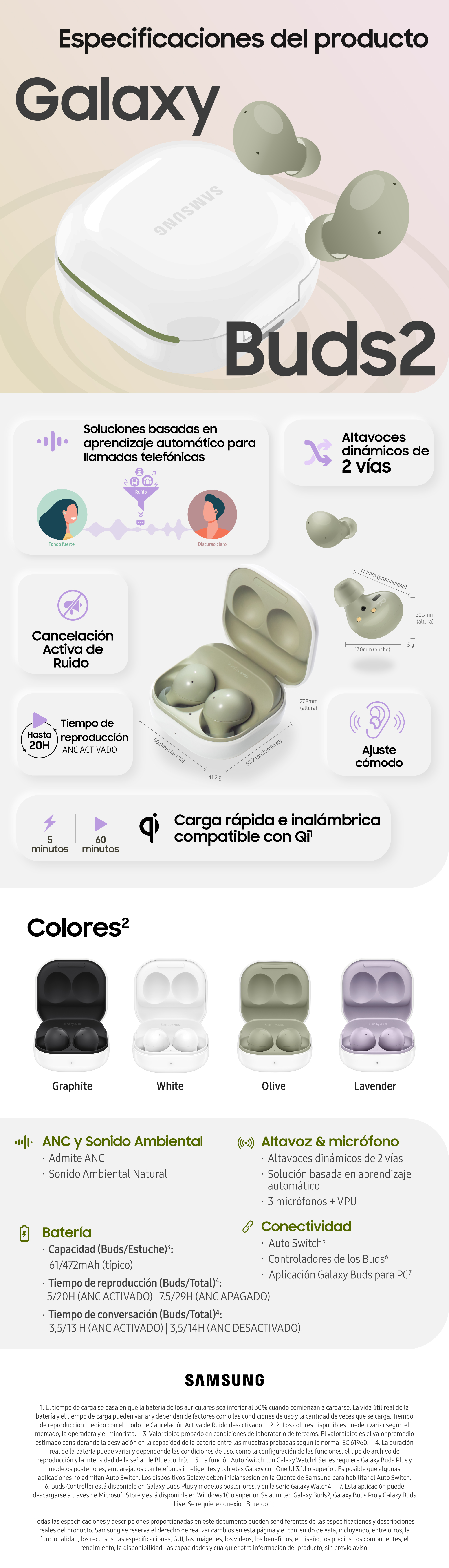 Con una gama de nuevas funciones para llevar tu experiencia de audio al siguiente nivel, los Galaxy Buds2 no solo hacen que la voz sea más clara en las llamadas, sino que también permiten sumergirte por completo en la música, videos y entretenimiento. Los Galaxy Buds2 son los auriculares más livianos y pequeños de toda la serie Galaxy Buds y cuentan con un diseño icónico de forma curva que viene en cuatro colores contemporáneos: grafito, blancos, verde olivo o lavanda. Diseñados para adaptarse de forma continua al ecosistema Galaxy y equipados con una batería de larga duración, los Galaxy Buds2 brindan experiencias de sonido inmersivas con una carcasa elegante y expresiva.