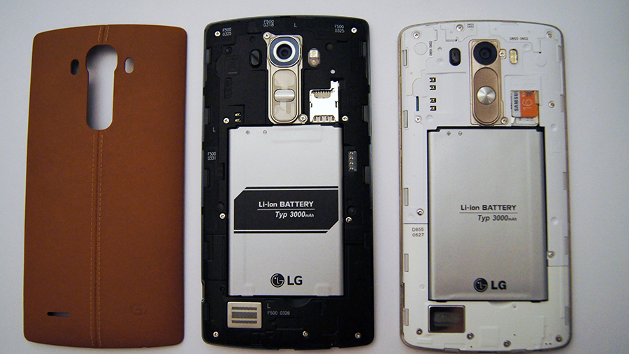 LG G4 y LG G3, ambos con batería extraíble y soporte para memorias microSD.
