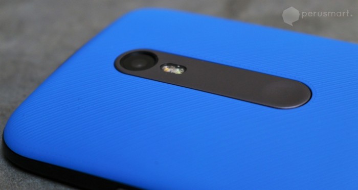 La parte trasera es de plástico rugoso y es intercambiable, en la caja se incluyen dos tapas adicionales: azul y verde limón. En la parte central trasera nos encontramos una banda trasera que incluye de abajo hacía arriba la cámara trasera, el doble Flash LED de doble tono y el logo de Motorola, al igual que los nuevos modelos presentados a fines de Julio.
