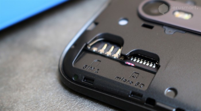 Al retirar la tapa nos encontramos con las ranuras para la microSIM, ranura para microSD de hasta 32 GB, batería de 2470 mAh y es no removible.