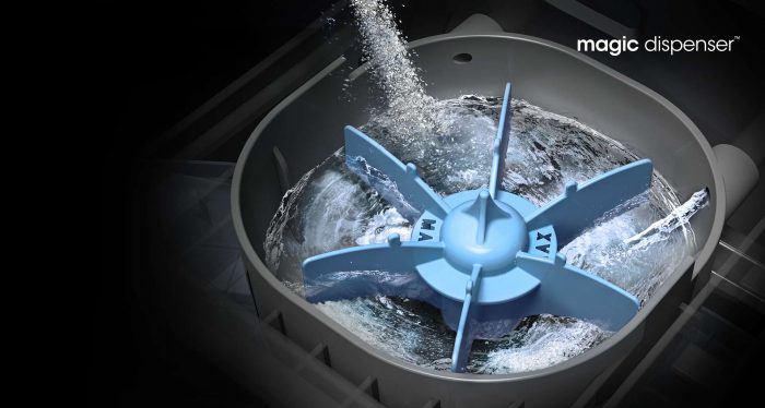Pensando en los elementos del lavado, Samsung presenta el Magic Dispenser, un dispositivo que disuelve el detergente en polvo antes de tener contacto con las prendas, con lo cual no solo se obtiene ropa libre de residuos químicos, sino también un uso eficiente del detergente. Lo mejor de todo es que permitirá reducir el número de enjuagues, que nos va a permitir tener un importante ahorro de agua.