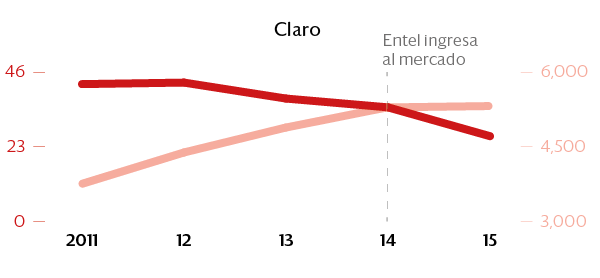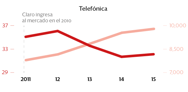 Así, primero tenemos las gráficas de los ingresos y beneficios de Movistar y Claro, operadoras con mayor antigüedad que habrían sido las más golpeada con la llegada de la competencia.