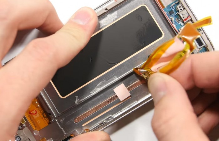 Gracias a Jerry Rig sabemos que en ese tubo donde se encuentra la refrigeración de los nuevos teléfonos de Samsung apenas tiene líquido. El material del tubo es de cobre y según lo que nos comenta Rig posee muy escasa cantidad de líquido, posiblemente agua, que se evapora al enfriar el CPU y que nuevamente se condensa en líquido para volver al tubo.